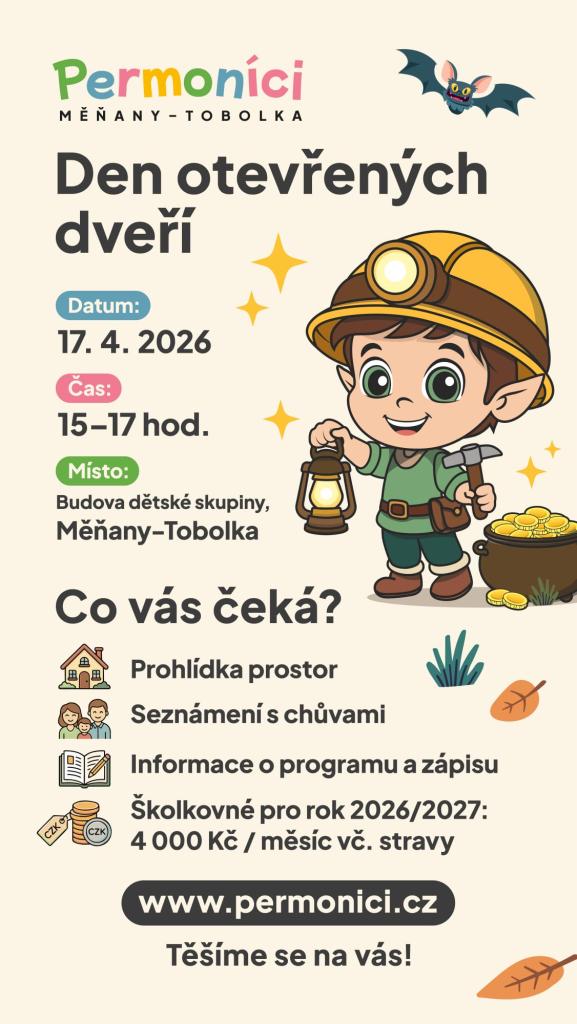 Přijďte na den otevřených dveří do budovy dětské skupiny Permoníci, který se koná 17. dubna 2026 od 15:00 do 17:00 hodin. Během akce si prohlédnete naše prostory a seznámíte se s chůvami. Získáte také informace o programu a přihlášení do dětské skupiny.